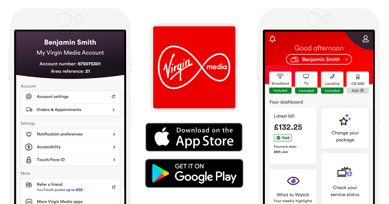 Broadband, TV and home phone customers: the App will work on a device (iPhone, iPad, Android phone or tablet) where sign in has been completed using My Virgin Media account details. It’s not always possible to guarantee that we’ll be able to offer this app on every device, platform and operating system version or variant. Terms and conditions apply. Further Legal Stuff applies.