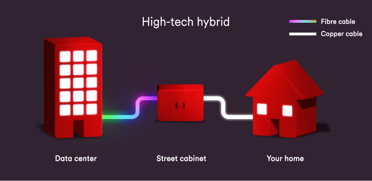 The connection zips along – sometimes underground, sometimes across aerial poles, and through our street cabinets. When it reaches your home, a fibre optic cable will guide it in through a small hole – this’ll end on an outer wall or plug straight into our kit.